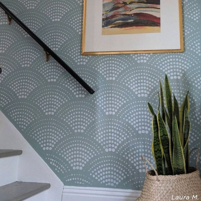We love this mod Radiant Scallop stencil! You can use this wall design on a dining room wall, in a hallway, in a bath, or as a bedroom accent wall. Perfect scallop stencil design for midcentury interior or for a classy clean modern bedroom. Stencil it in metalics on a dark background color for a super glamorous effect! Dot patterns are having a huge comeback and this wall stencil is right on "spots" trend. Consider using a stencil for wall painting project instead of purchasing costly and difficult to install wallpaper.