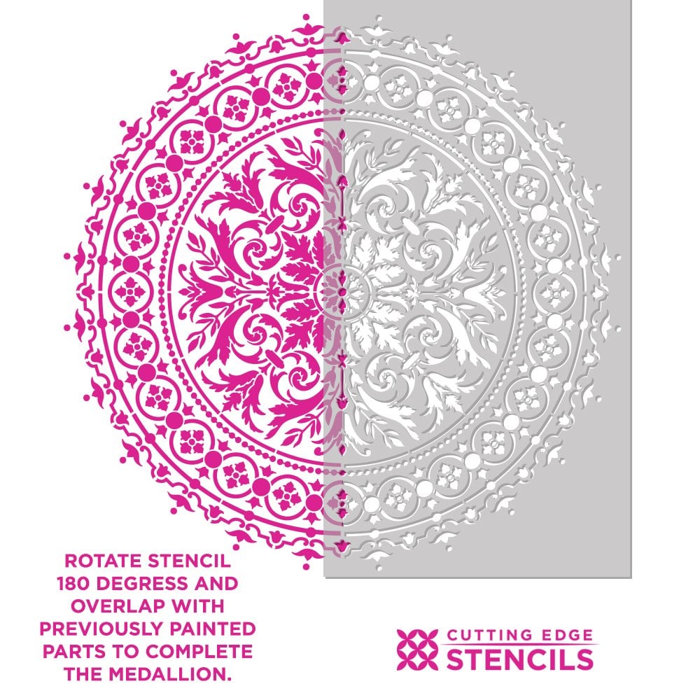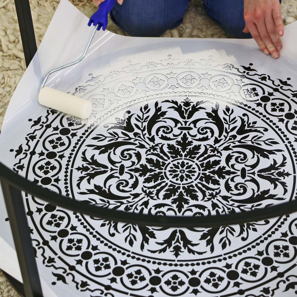 This medallion stencil is so easy to use, virtually anyone can do it. Simply tape it to the wall using BLUE painter's tape, then load your foam roller with the paint of your choice (latex or acrylic). Get rid of excess paint by rolling the foam roller over a folded paper towel. Then, just roll it over the stencil applying medium pressure for an instant fabulous result! Don't press on the roller too hard otherwise you might get some paint seepage under the stencil.