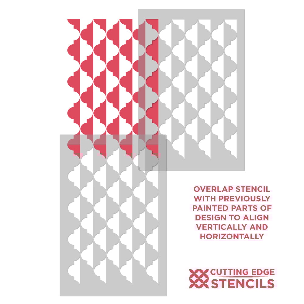 Stencil features an easy registration system, just use parts of the previously painted design to align the stencil, check for level and continue. This gives you a seamless "wallpaper" look. Don't worry about super perfect alignment: in the end your eye will never ever notice the discrepancy.