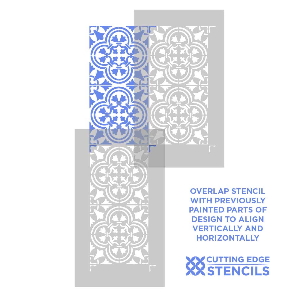 About registration marks: you can use them to align your tile stencil repeats, or not! It really depends on what surface you're stenciling. When stenciling over an existing old tile, the registration marks might not be helpful as the grout width varies from floor to floor. In this case, simply mask out the registration marks with pieces of blue tape, and align the stencil by eye by centering it on each old tile. If you are stenciling over a wall, or linoleum/cement floor - please use registration marks for easy alighnment of your tile stencil. Please see our alignment pic for reference.