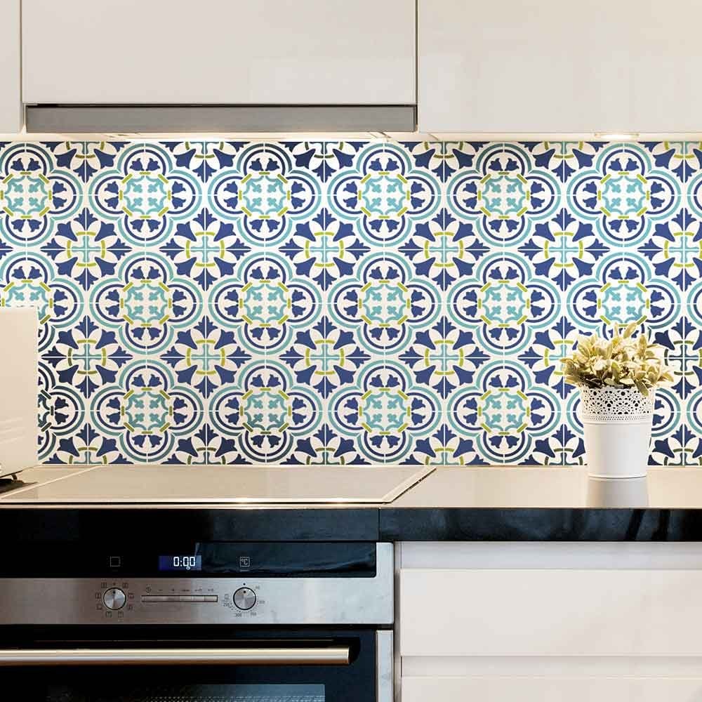 Our Augusta Tile stencil is a great choice for a trendy makeover! Based on traditional Portuguese Azulejos tile designs, this tile stencil is perfect for creating a gorgeous accent wall, kitchen tile backsplash, stenciled staircase, table top or floor! This spanish tile stencil works great for traditional and contemporary room settings - just use various color combinations. The most trendy color combos include soft greys and taupes and also variations of traditional deep blue color. Use stencil brushes for a multi-color look, or simply roll with a dense foam roller for a monochromatic effect. This stencil will definitely make a statement in your space! You can create really stunning stenciled stairs with this tile pattern! 6" size fits risers on most staircases.