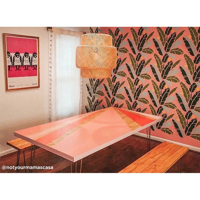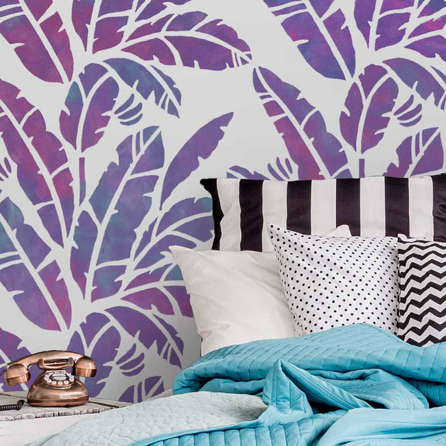 Obsessed with trendy Martinique Wallpaper? So are we! Thats why we created our Banana Leaf stencil, inspired by the iconic tropical print. Tropical wallpaper can be so pricey and tricky to install, so now you can create the banana leaf pattern inexpensively and easily using our reusable wall stencil. So get on the tropical trend with this large palm leaf stencil pattern! You can almost feel the breeze blowing through the tropical leaves.