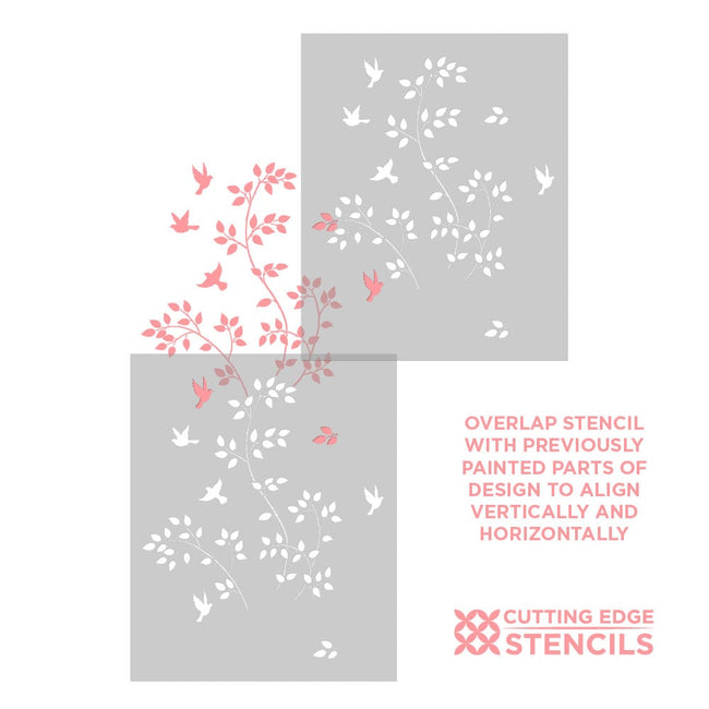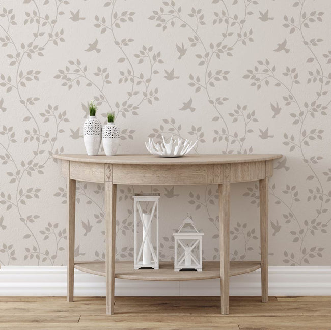 An array of Songbirds can be seen playfully fluttering among the delicate trails of leafy vines in our Morning Song wall stencil. This uniquely beautiful botanical wall stencil brings a charming touch to any room. Stencil this whimsical pattern in just one color for a fresh farmhouse feel or use multiple colors to create a lively contemporary living space.
