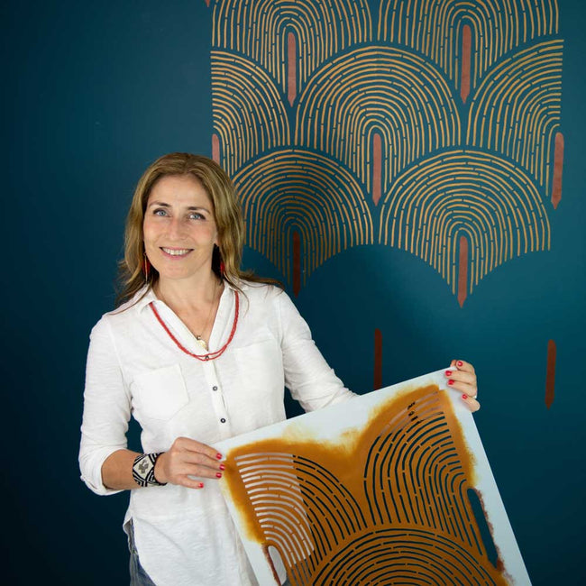 You can stencil with acrylic or latex paint, stencil creams, fabric paint or plaster of your choice. Use a foam roller or stencil brush. You can trowel the plaster through the stencil to achieve stunning dimensional effect.