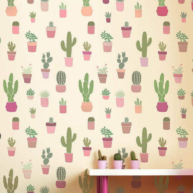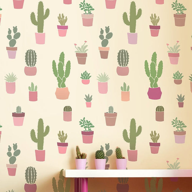 Love Cactuses but don't like their needles? Then our Cactuses Allover wall stencil is just what you need. This design works great for Southwestern decor for your kids nursery. No need for cactus wallpaper when you can DIY with this great allover stencil. This stencil pattern is a medley of cute little potted cactuses perfectly arranged to bring your nursery or kids room into the latest trendy look.