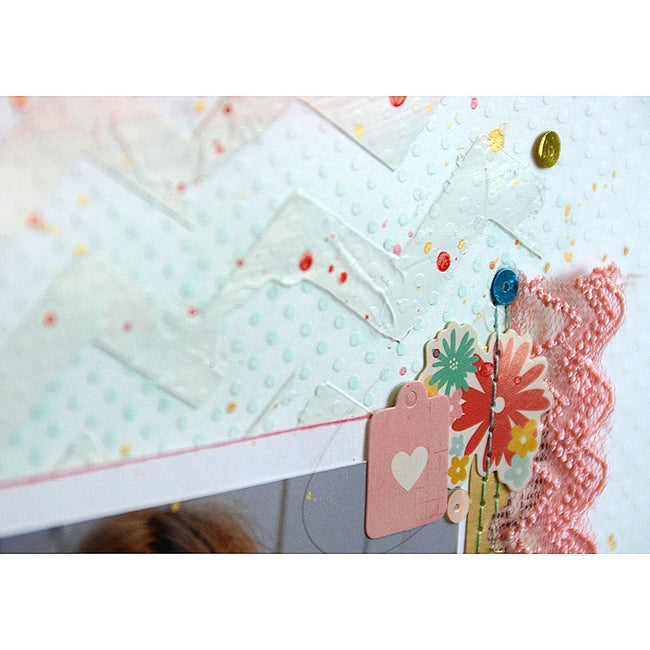 By using simple white paint on this stencil onto white card stock (see pics), we created a perfect subtle pattern and background for a scrapbook page. Rubbing a bit of ink and spritzing a little colored mist allowed us to help the pattern pop without letting it overwhelm my soft page.