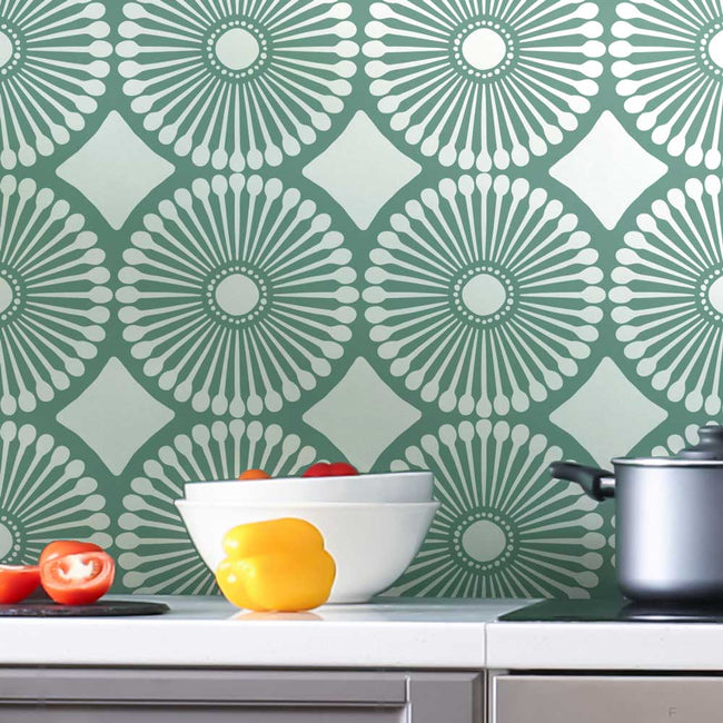 You can stencil with acrylic or latex paint, stencil creams, fabric paint or glaze. Use a foam roller or stencil brush. Although most of our stencils do not require the use of spray adhesive, if your walls have a texture to them, this pattern could benefit from it to help minimize paint seepage (Elmer's spray adhesive seems to be the best). Make sure you shake the can well and lightly mist (not drench) the stencil, and let it dry for a moment before positioning it on the wall. This step will prevent the adhesive residue transferring to the wall. You'll need to re-mist the stencil after a few repeats. Note: you will still need to hold the stencil in place with a few pieces of blue painters tape! Adhesive by itself is not enough to hold the stencil on the wall. Clean-up tip: Spray the stencil with Simple Green to help to remove adhesive residue.
