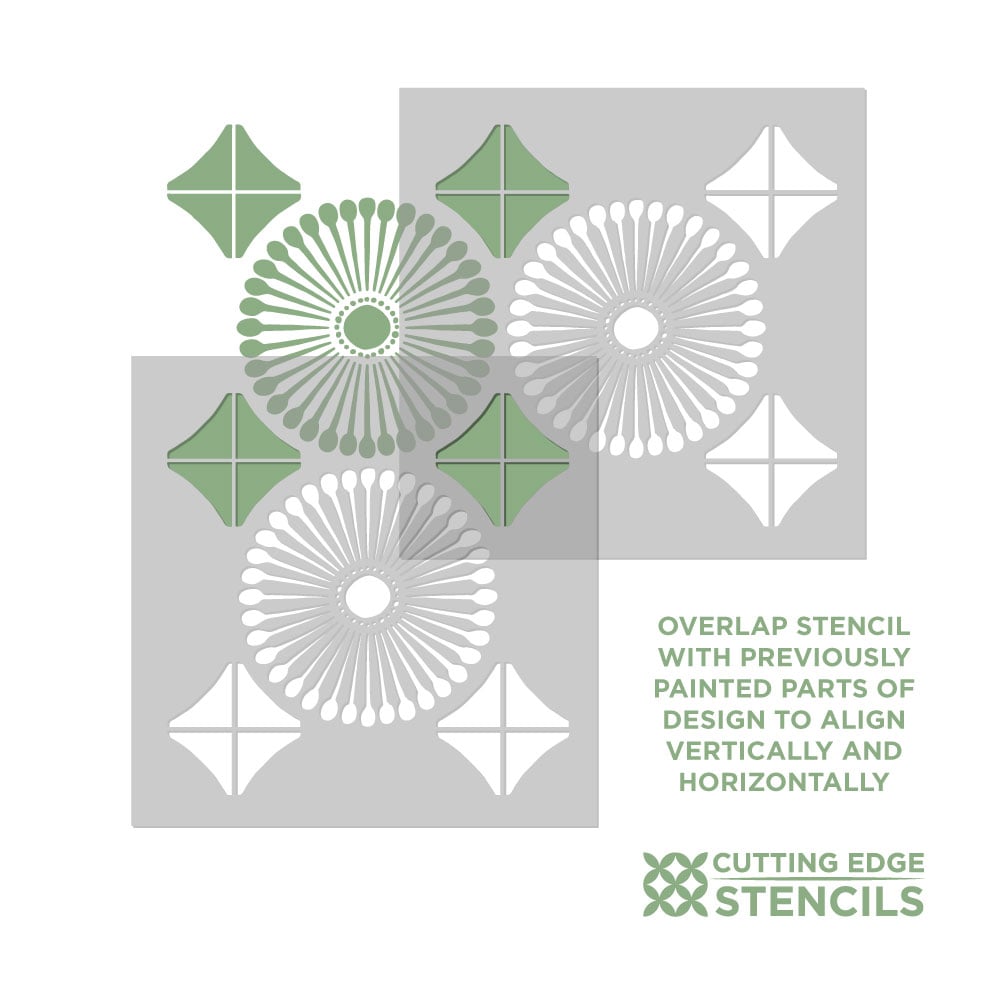 Our Daisy Tile stencil is a lovely tile stencil pattern that showcases a beautiful floral design in the center of it! Accentuate the floral stencil design by stenciling the tile pattern in multiple colors with brushes for stenciling. Even if you choose to paint over the tile stencil in one solid color with a dense foam roller, this charming tile stencil design with still be a delightful addition to your home! This tile stencil pattern is right on trend with the Cottage Core aesthetic, but you can also stencil this tile pattern in a modern farmhouse or boho interior. The tile stencil looks fabulous on floors, backsplashes, fireplaces, and even walls!