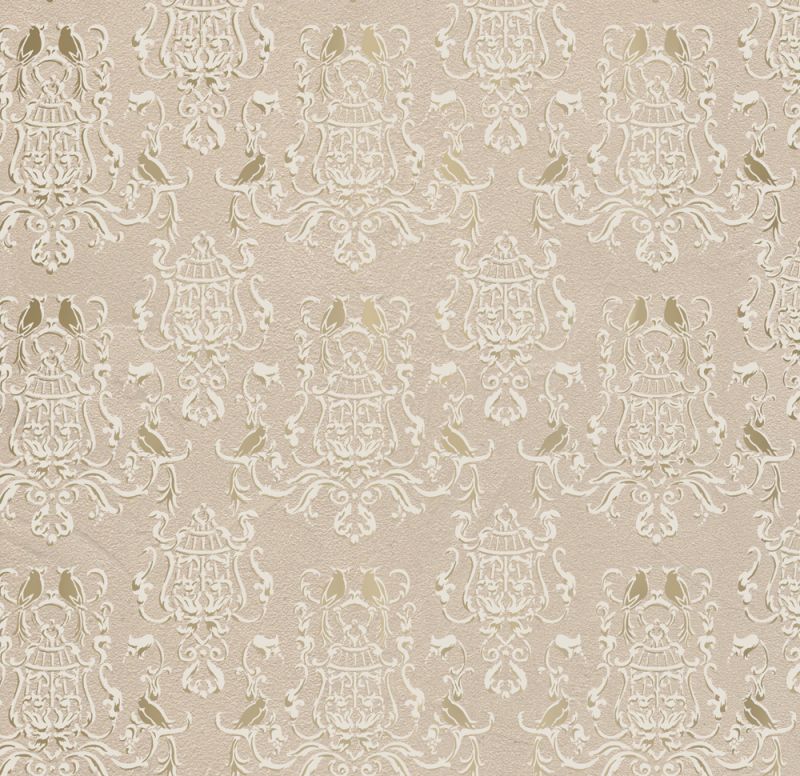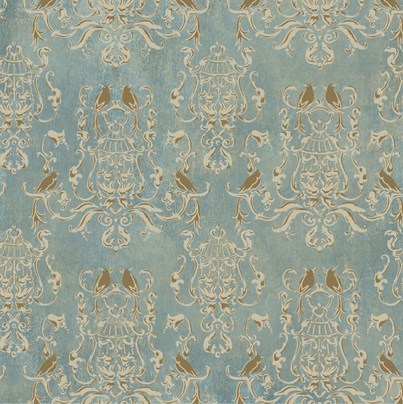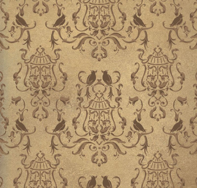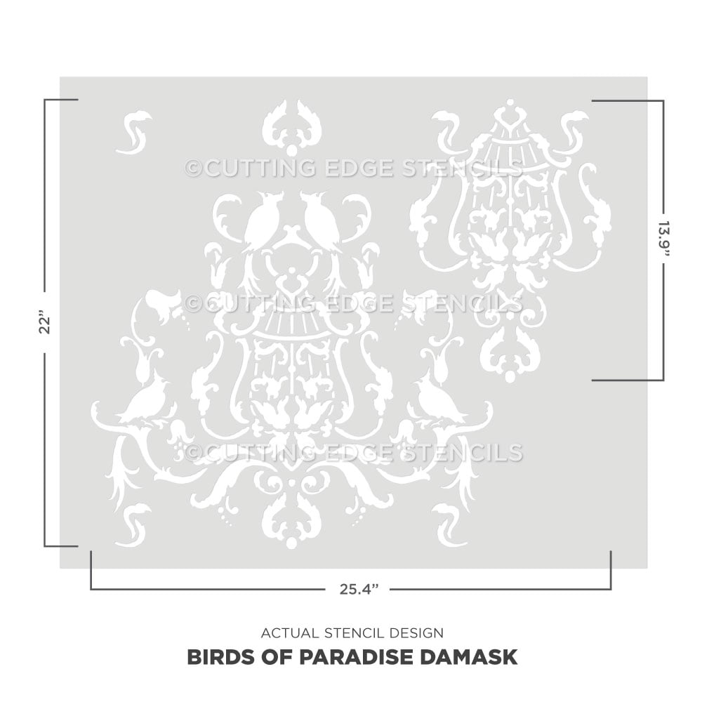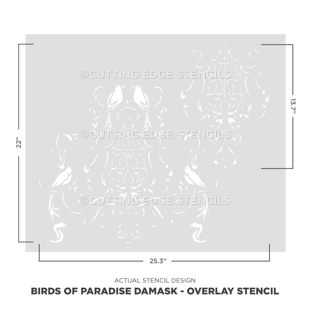 This is the fabulous 2 overlay Birds of Paradise Damask. We started with our single overlay Bird damask and added a second overlay for highlights and extra detail. Second plate looks great stenciled in metallics; it adds sophisticated shimmer to the pattern. Registration is built into design for the ease of installation.