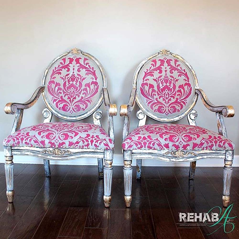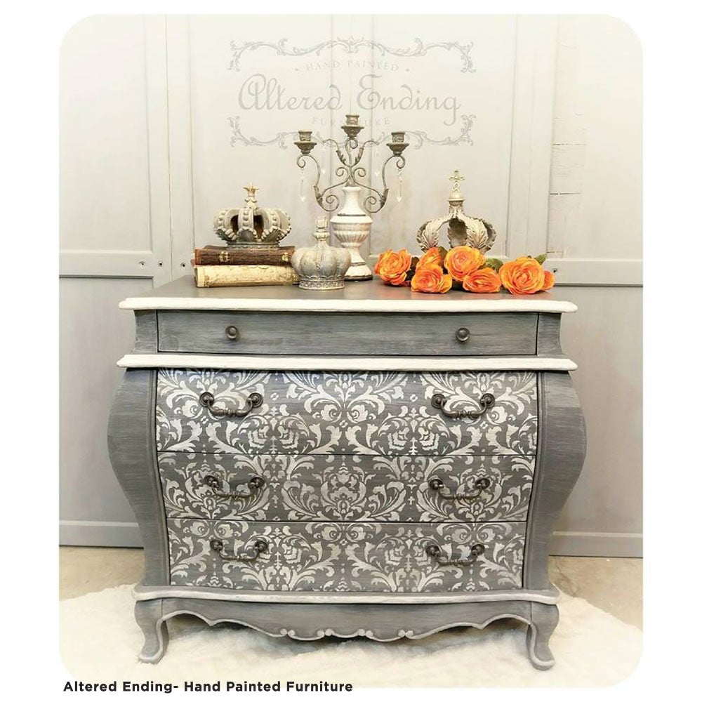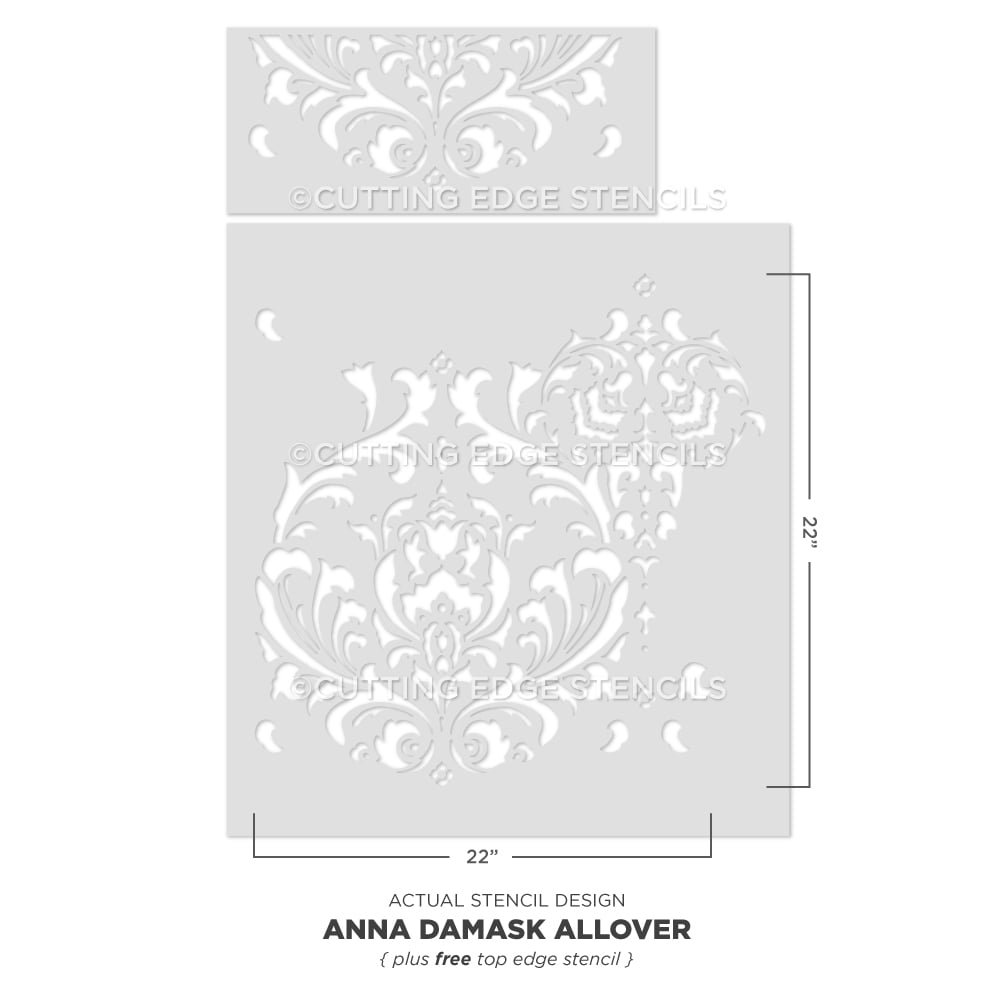Damask stencil Anna is one of our most popular designs. This stenciled damask looks fabulous every time. Inspired by a classic damask wall-covering design, this elegant brocade pattern looks so beautiful over a soft sponged background, or over a metallic strie.