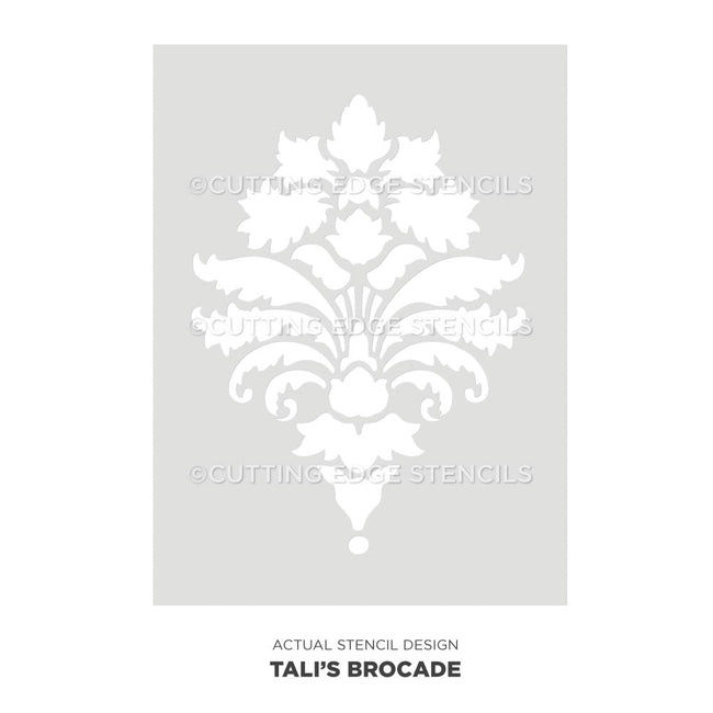 Classical damask stencil Tali's Brocade for wall decor. Consider trying a reusable stencil instead of wallpaper for your next DIY wall decorating project! Reusable wall stencils give you a look of designer wallpaper at a fraction of the cost, plus you can perfectly coordinate your paint colors with your existing decor (furniture, bedding, rugs or curtains).