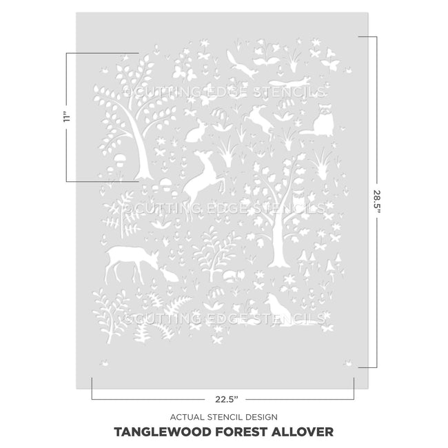 Check out this lovely woodland stencil called Tanglewood Forest! This whimsical forest stencil is right on trend, as nature woodland and magic forest themes are very popular in today's nursery decor. You can stencil all the elements in one color using a dense foam roller for a simple monochromatic effect, or get crafty and paint each animal stencil and tree stencil in various colors using stencil brushes. This, of course, will take more time but it will be so worth it! Selecting a dark color background paint with make the whole design pop, as the animals and plants will be stenciled in lighter paints on a dark wall. Unlike pricey woodland nursery wallpaper, our reusable animal stencil offers you an opportunity to choose your own color combinations and to perfectly match your decor. Stencil this magical forest design complete with cute foxes, deer, raccon, squirrels and bunnies in your kid's room or nursery! Bring the nature in, it's good for your little one :) Use stencils and save big on your nursery project!