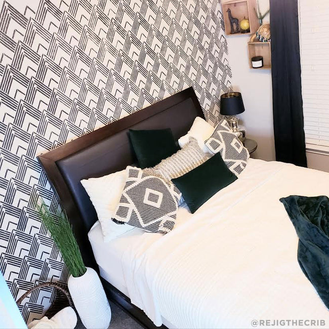This geometric stencil pattern comes with an additional FREE Top Edge stencil: the upper part of the design cut as a smaller separate stencil. It makes it easy to fill the gaps close to the ceiling line after your main pattern is stenciled.