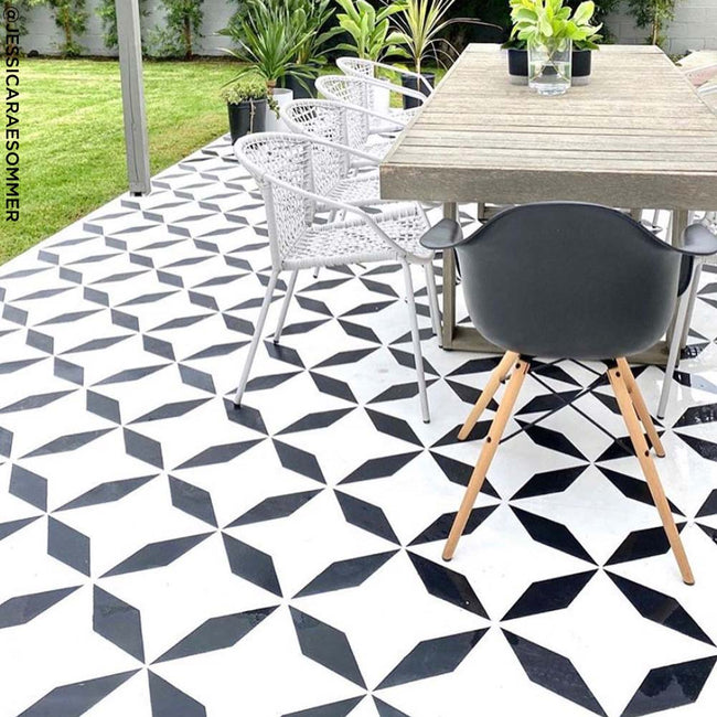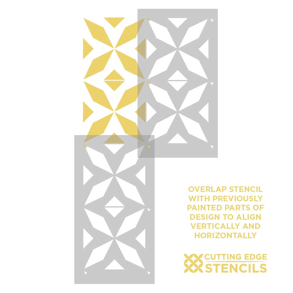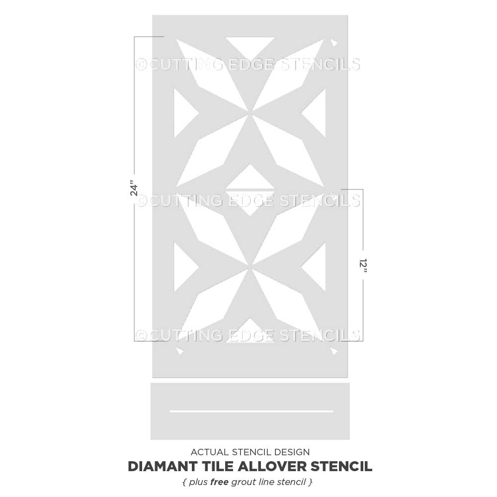 Our Diamant Tile stencil is inspired by a classic geometric encaustic cement tile design, which is both classy and timeless. This cement tile stencil is perfect for creating a gorgeous painted tile floor, kitchen tile backsplash, accent wall or even a faux tile table top! With our tile stencils, you can create a dramatic tile floor on a budget and save big on bath and kitchen renovations! No need to rip out your old tile, as you can stencil right over it. Just imagine the savings!