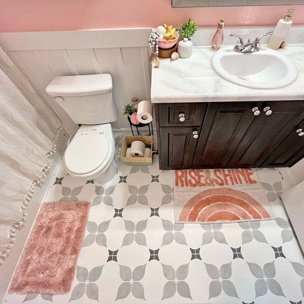 The inspiration for our Dogwood Tile Stencil pattern comes directly from the delicate flower that blooms on the infamous Dogwood Tree! Use our Professional Stencil Brushes to stencil this lovely floral tile stencil pattern in two different neutral tones. This tile stencil pattern looks best in small spaces like a laundry room or powder room. Give this design a chic, modern look by stenciling this faux tile in a larger scale and one solid dark color. This nature-inspired tile stencil fits the cottage core and modern farmhouse aesthetic. The tile stencil looks fabulous on floors, backsplashes, fireplaces, and even walls! Learn How to stencil a tile – it’s easy even for beginners!