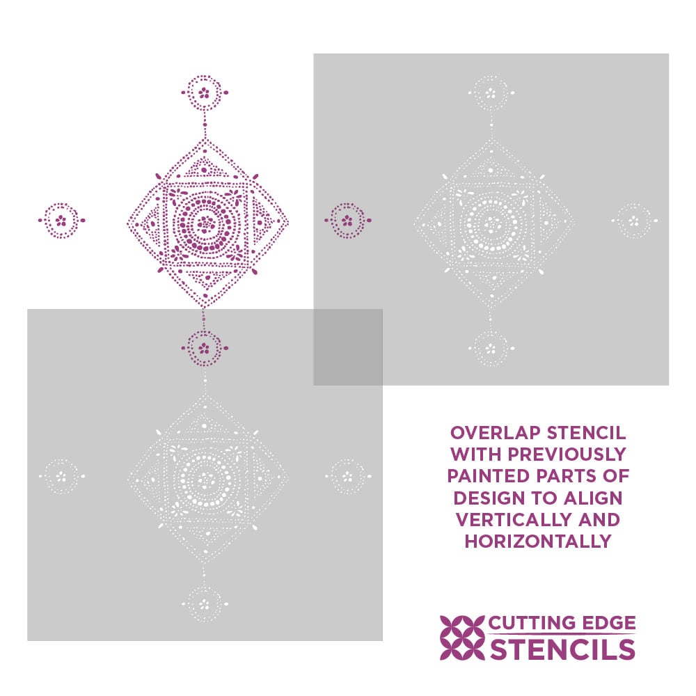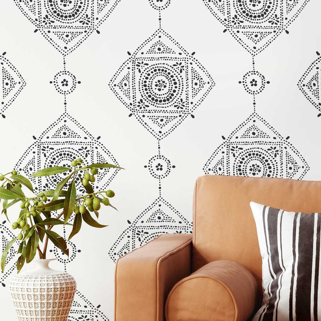 Our tribal-inspired Dotted Medallion Wall Stencil is the perfect combination of bohemian and ethnic patterns! A collection of small dots makes up a beautiful, organic design that is pleasing to the eye. This wall stencil pattern can make any room feel like a cozy, globally inspired hangout, no matter the color combination! Use this batik stencil pattern over a white wall for a modern, modern boho chic look. You can also use this stencil pattern with a more saturated color scheme of rich indigo blues for a traditional bohemian look! This wall stencil comes with built-in registration marks for easy alignment each time!