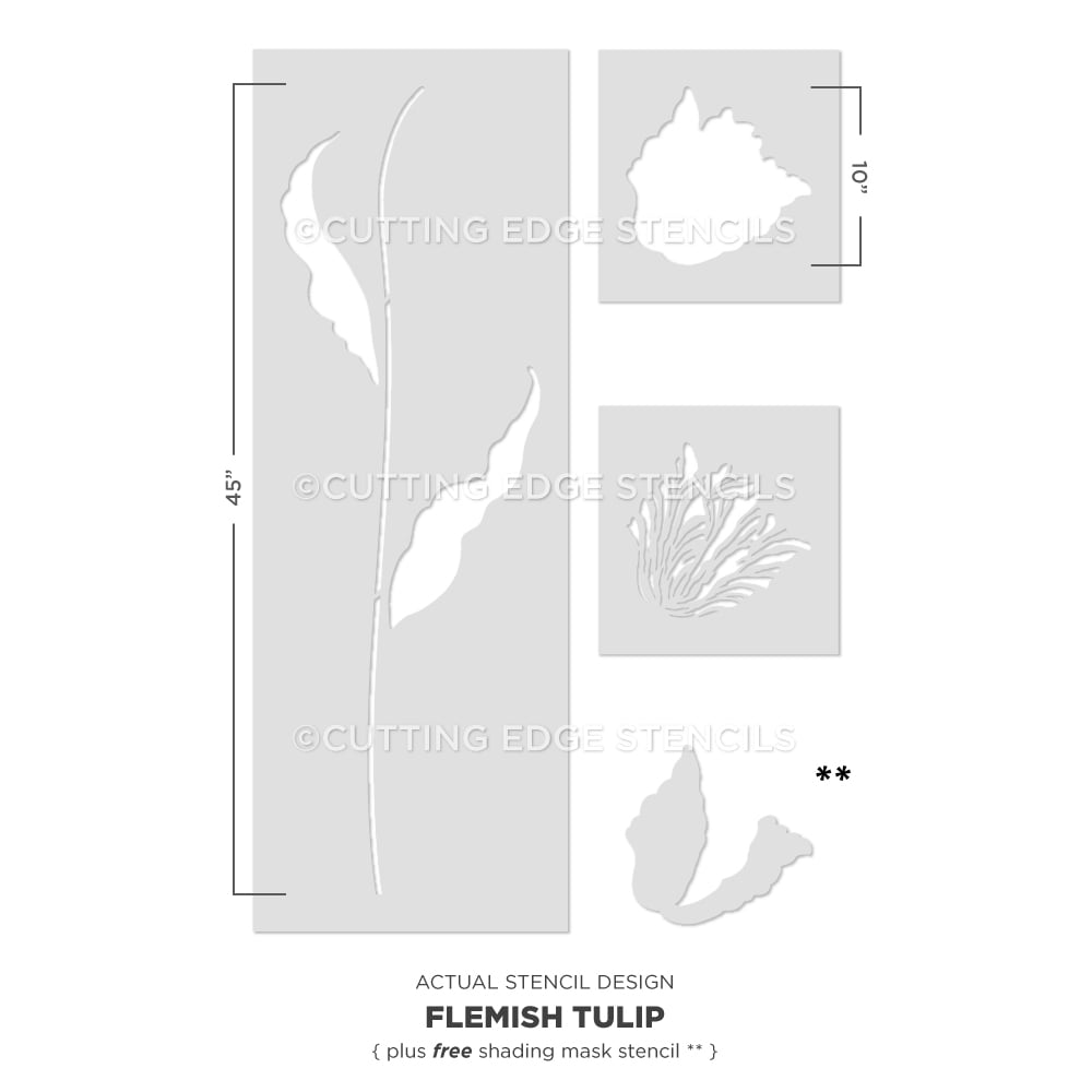 Introducing our large floral stencils inspired by Flemish paintings! Reminiscent of trendy dark floral wallpaper, our reusable Tulip flower stencils offer a similar dramatic look for a fraction of the cost. The flower head is a 2 overlay stencil which requires stenciling the main flower shape first, letting it dry, and then stenciling the stripes using the second stencil overlay. These large wall stencils are perfect for smaller spaces such as powder rooms, hallways or small accent walls. This Flower stencil looks great stenciled on dark jewel tones just like the original Dutch paintings that they were inspired by.