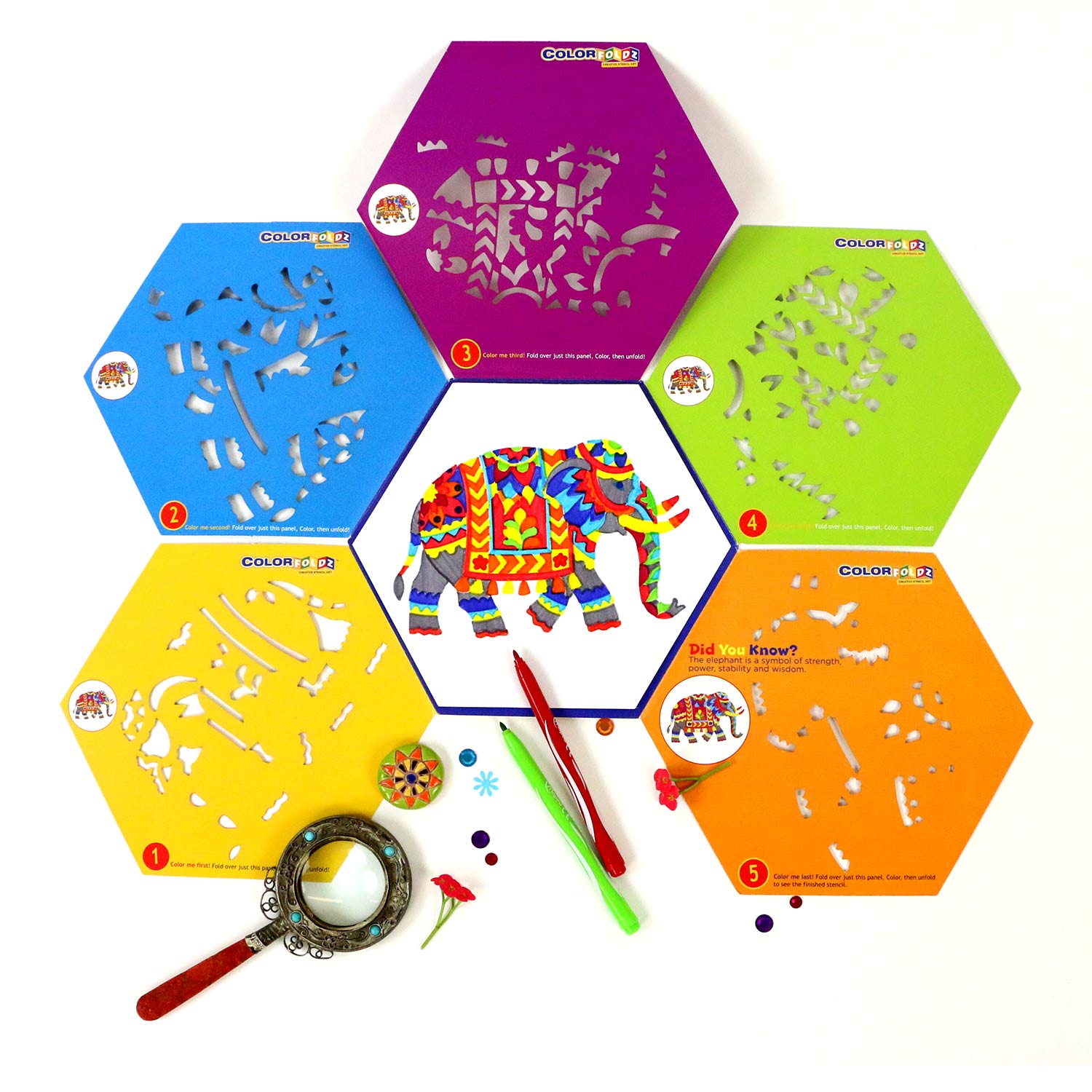 Try coloring this intricate Indian Elephant with our ColorFoldz Self-Aligning Stencil! This design is loaded with detail and so rewarding to draw!