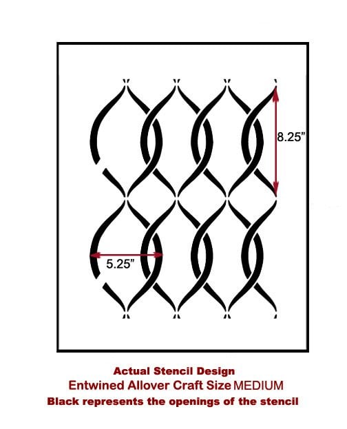 Our craft geometric stencil pattern Entwined is perfect for smaller DIY home decor projects where a wall stencil would be too large. Our craft stencils are great for stenciling your own designer pillows or curtains or transforming garage sale furniture finds into cool decorative pieces. It doesn't end there: try stenciling lamp shades, kitchen backsplashes, doors, table tops, picture and mirror frames, or create your own work of art on pre-stretched canvas. Decorative possibilities are endless with these versatile reusable stencil patterns!