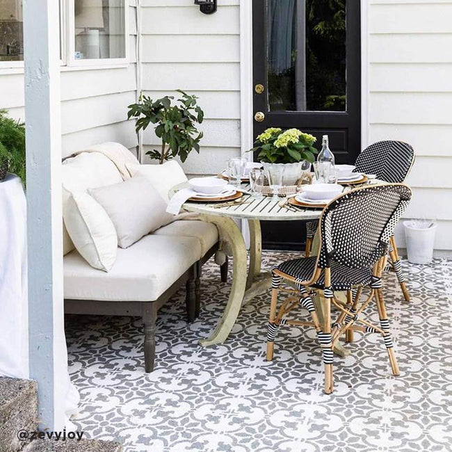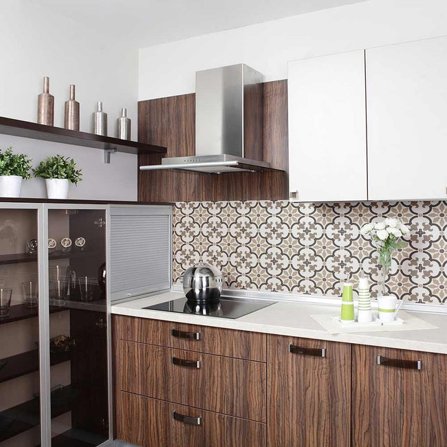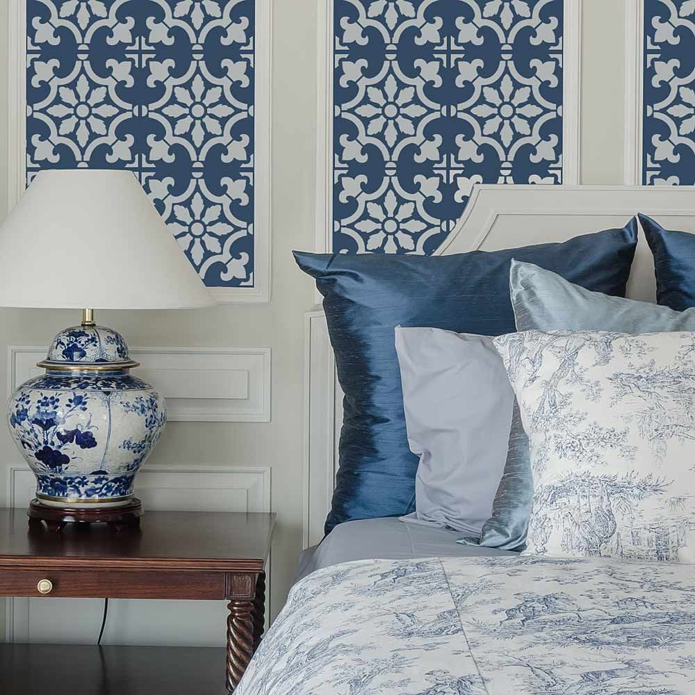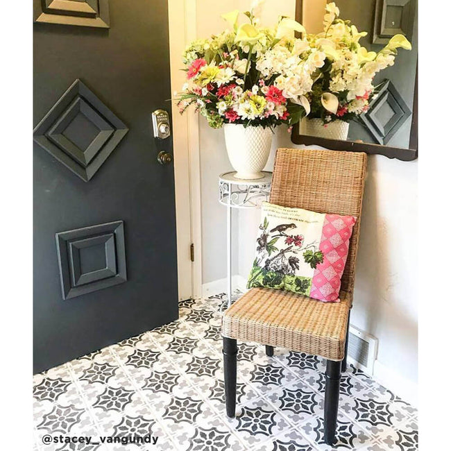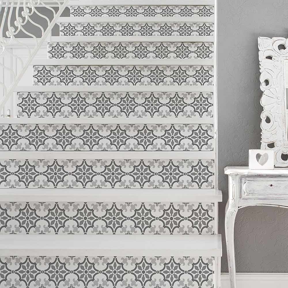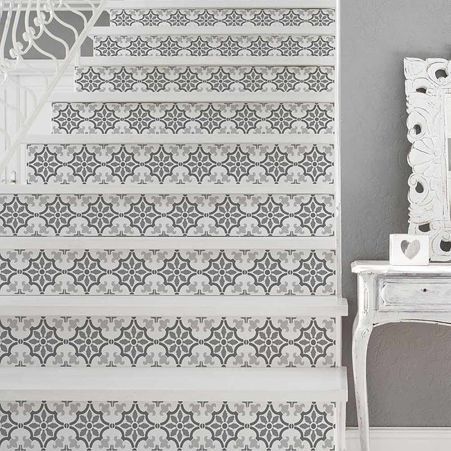 Our Fabiola Tile stencil is a great choice for a trendy makeover! Based on traditional Portuguese Azulejos tile designs, this tile stencil is perfect for creating a gorgeous accent wall, kitchen tile backsplash, stenciled staircase, table top or floor! This spanish tile stencil works great for traditional and contemporary room settings - just use various color combinations. The most trendy color combos include soft greys and taupes and also variations of traditional deep blue color. Use stencil brushes for a multi-color look, or simply roll with a dense foam roller for a monochromatic effect. This stencil will definitely make a statement in your space! You can create really stunning stenciled stairs with this tile pattern! 6" size fits risers on most staircases.