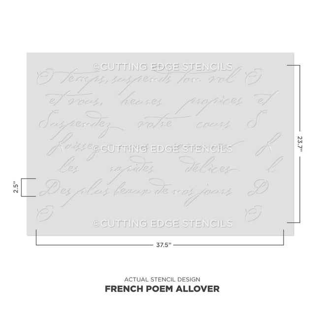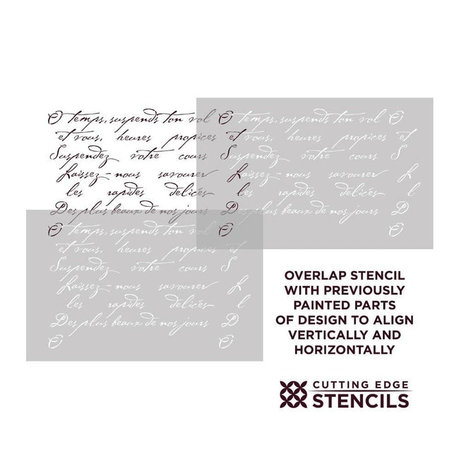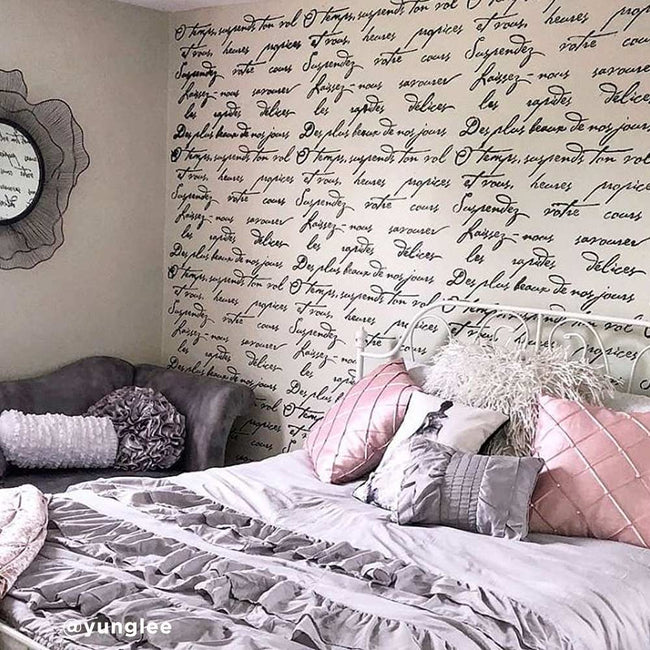 This beautiful French Poem typography wall stencil is more than just a pretty (type)face. It's a daily reminder to cherish every moment! The letter stencils look hand-written, which adds to its romantic look. This stencil looks fabulous when painted on walls and furniture, or done "tone on tone." A very sophisticated look without being stuffy. Classy, elegant and charming, the French Poem stencils add a soft, appealing look to your home decor. Use this stencil design on your walls, make one-of-a-kind-stenciled curtains, or up-cycle on old piece of furniture for that romantic, shabby chic look!