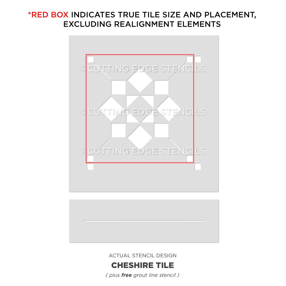 Our Cheshire Tile Stencil was inspired by the beautiful bespoke geometric English floor tile patterns that you see at front entrances and in hallways in England. Reusable tile stencils are the perfect money saving alternative to the popular but pricey cement tiles. Yes, you can paint your old tile without the hassle of ripping it out! You just have to use the proper paint, primer and top coat and your stenciled tile will last for years. Talk about savings! This geometric tile stencil design looks fabulous on floors, accent walls, fireplaces, and even kitchen backsplashes. Our tile stencil designs are super easy to use and provide big savings when compared to more costly alternatives like designer wallpaper or cement floor tiles. Get a Pinterest-worthy tile floor for a fraction of the price of installing real tile! This stencil design will definitely make a statement in your space! Learn How to stencil tile – it’s so easy even for beginners!