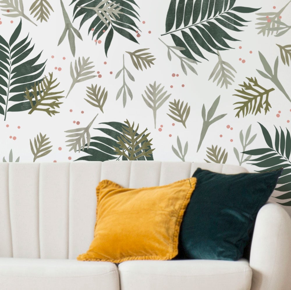 Our lovely Green Foliage Wall Stencil kit features beautiful organic tropical leaf stencil shapes that are easy to combine into a pretty pattern on your wall. Randomly arrange the leaf stencils on your walls, select a color scheme that works with your existing furnishings, and simply stencil them in! No alignment necessary, and so easy for beginners. You can overlap the stencils, and use all kind of rotations for these plant leaf shapes - it's going to look good anyway. Unlike wallpaper, you can use any color you want for your wall stenciling project. These tropical stencils are right on trend with all the botanical wallpaper designs. Nature-inspired floral stencils will look perfect in any room!