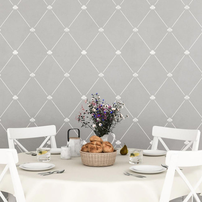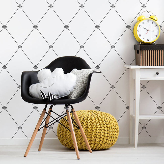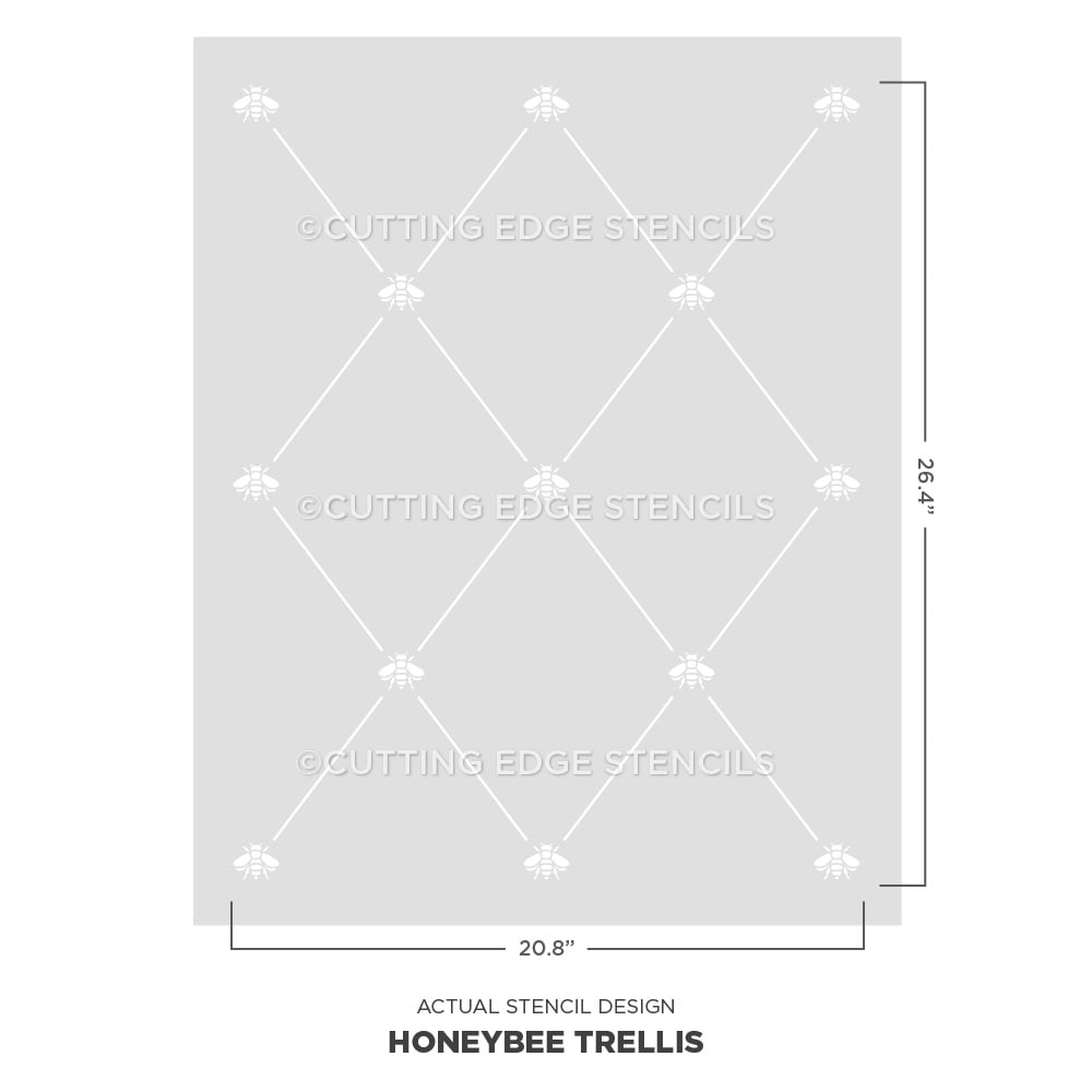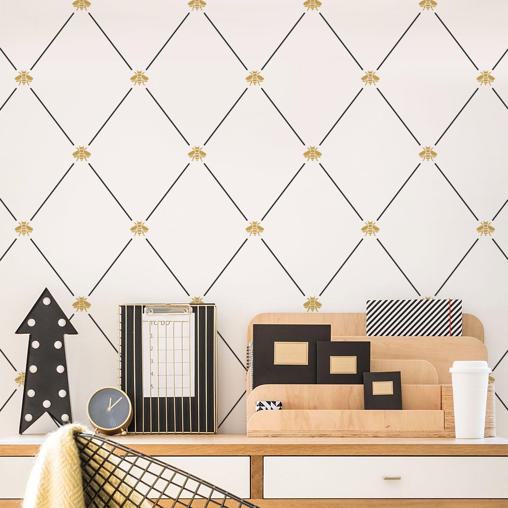 Our classy French Honeybee Trellis stencil combines the traditional elegance of a diamond trellis pattern and lovely French bees into one fabulous wall pattern. This trellis wall stencil’s thin lines and small honeybees look amazing when stenciled in metallic paint! Give the impression of expensive wallpaper with this fashionable Honeybee Trellis wall stencil. Perfect stencil pattern for the bee-themed nursery!