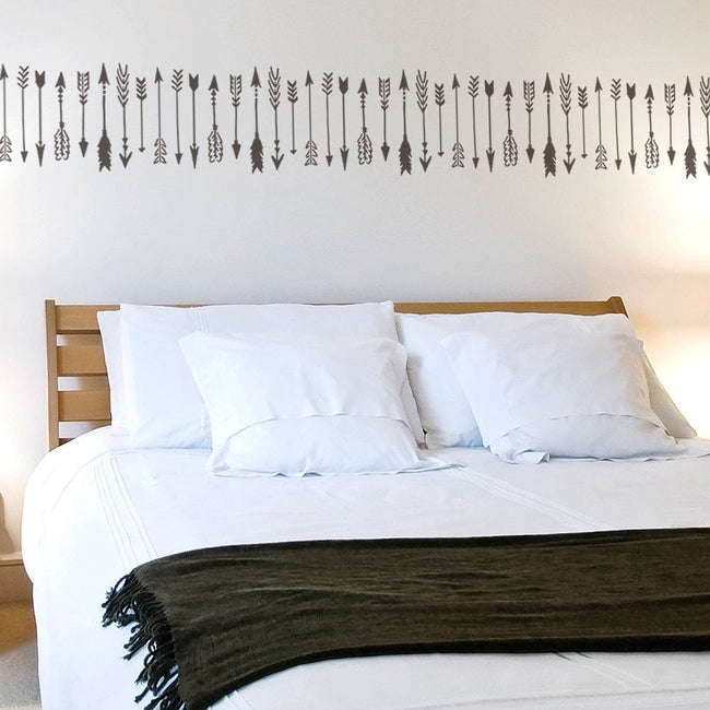Our Indian Arrow Border stencil is another awesome addition to our arrow motif collection. Hand drawn and "imperfect", it reflects the primitive tribal art influences. Borders are an easy stenciling project and a great way to add interest to any room. This simple arrow stencil border is at home in both contemporary or traditional interiors. Try it in hallways, living rooms and dining rooms. It also works perfectly for the kids room or any room with a hint of South-Western decor.