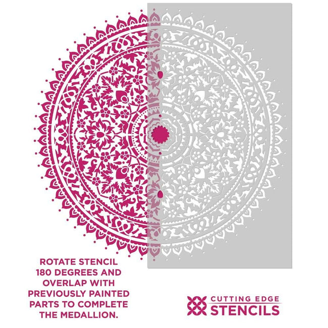 For the mandalas that are 18" to 30", you will be receiving a full medallion. For the 36" and 44" mandalas, you will receive half of the design and to complete the medallion, pick up the stencil after completing one side, flip it and line up the registration marks (see photo above), tape it and do it again.