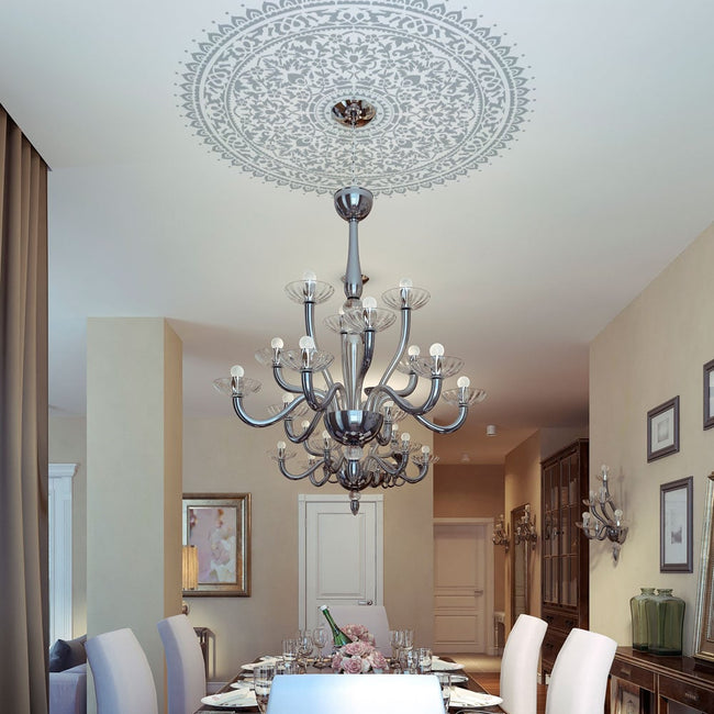 This medallion stencil is so easy to use - virtually anyone can do it. It's better to remove the light fixture when you stencil, but you can stencil with the fixture in place, too. You'll need to mist the stencil with spray adhesive (Elmer's is great) then tape the stencil to the ceiling using BLUE painter's tape, then load your foam roller with the paint of your choice (latex or acrylic). Get rid of excess paint by rolling the foam roller over a folded paper towel. Then, just roll it over the stencil applying medium pressure for an instant fabulous result! Don't press on the roller too hard otherwise you might get some bleed. Remove the stencil, rotate it 180 degrees, tape it and do it again.