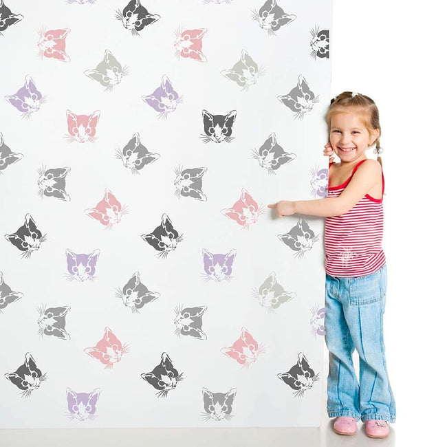 Who doesn't like a cute Kitten face? Our trendy Kitten stencil reflects the current cat obsession that is sweeping the fashion industry, from designer purses and clothing to bedding and accent walls. This allover stencil is super easy to use and is perfect for beginners. The cute cat face design can be done in a single color or multiple colors and is best stenciled with a dense foam roller. Our fun cat pattern is sure to bring a huge dose of cuteness to your child's space and is a perfect stencil choice for a nursery or kids' playroom.
