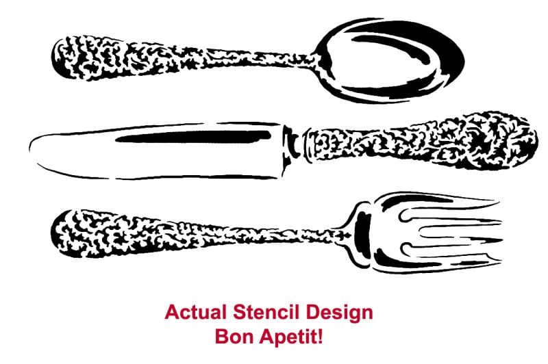 Finally a cool flatware stencil for the Dining room or Kitchen! Our "Bon Appetit!" wall stencil is oversized for a dramatic statement, yet refined with it's high level of detail. This is some very classy silverware!