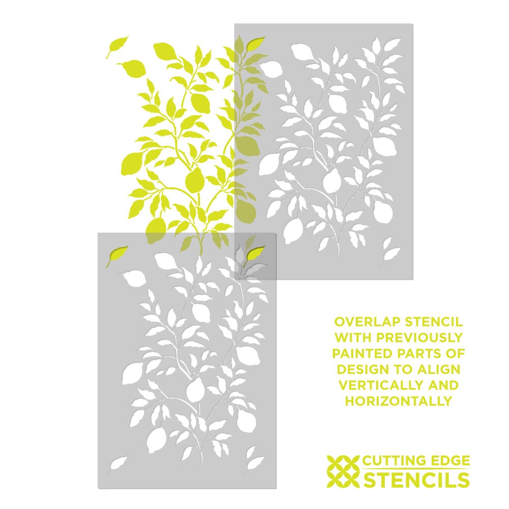 This stencil design is created by stencil artist Janna Makaeva and is exclusive to Cutting Edge Stencils. While it takes an artist to draw a good stencil, stenciling itself is an easy painting technique that doesn’t require any artistic ability. As long as you can hold a brush or a roller, you’re pretty much good to stencil! This stencil design can be painted with a foam roller and/or stencil brushes, depending if yu want it in one color or multi-color. You can use darker acrylic color (such as Raw umber) to shade the leaves and the lemons to add extra dimension, or simply use flat colors without shading. It will look beautiful no matter what you choose.