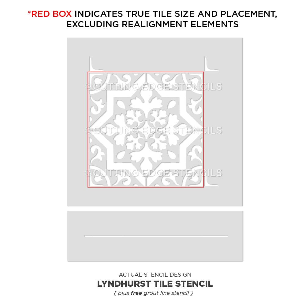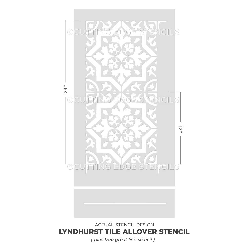 This trendy Lyndhurst Tile stencil was inspired by a classic antique cement tile pattern. Our tile stencils are a perfect money saving alternative to the popular but pricey cement tiles. You can stencil a gorgeous black and white kitchen backsplash, or use this stencil pattern over your existing floor tiles for a dramatic effect. This Lyndhurst tile stencil features built-in registration for easy stencil alignment, and also comes with a free grout line stencil.