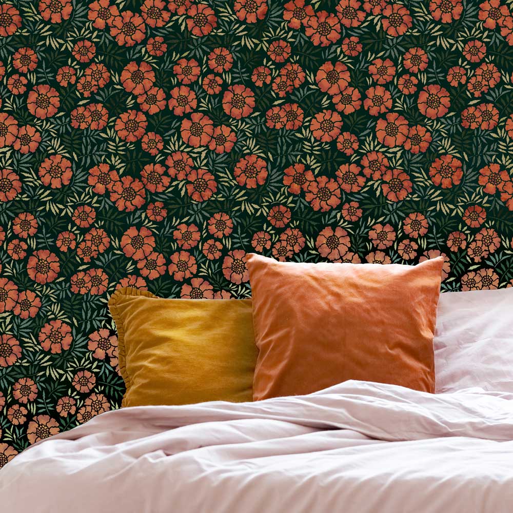 This beautiful floral stencil wall pattern Marigold was inspired by the real marigolds that grow in my garden. Their velvety burgundy and orange flowers are sophisticated and cheerful at the same time. This flower stencil fits all kinds of interiors and styles, it can even be used on a nursery wall. This stencil pattern can be applied to a wall with a dense foam roller or with a variety of stencil brushes. You can stencil it in one color, or try painting and shading various flowers and leaves with different paint colors. We love using craft acrylics for stenciling projects like this one.