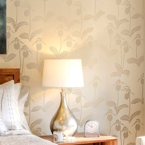 We created this feminine floral stencil pattern based on real orchids that grow in our garden! Our gorgeous Lady's Slipper stencil captures the elegance and sophistication of these rare wildflowers. Ephemeral orchids teach us to appreciate the magic and beauty of the present moment. This classy pattern looks great in bedrooms, baths, dining rooms, and any space that can use some romance and a beautiful feminine touch. Try this stencil design with the multi-color shading technique to bring out the full beauty of the flowers, or simply roll it in one color to reveal elegant floral silhouettes.