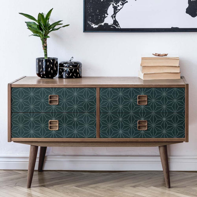 Our Osaka Craft Stencil's dotted thin lines make up countless geometric stars that give a piece of furniture a modern feel! The best part about this japanese-inspired stencil is that all color combinations work with its contemporary star stencil pattern! Our Osaka craft stencil looks great on all types of furniture pieces! Grab a dense foam roller and add this star stencil pattern to the front of an outdated dresser for a DIY furniture flip. You can even add this craft stencil pattern on a brand new table top to add a chic detail to your space. Feeling adventurous? Our Osaka Craft Stencils simple yet stylish design looks good when stenciled onto a statement door!