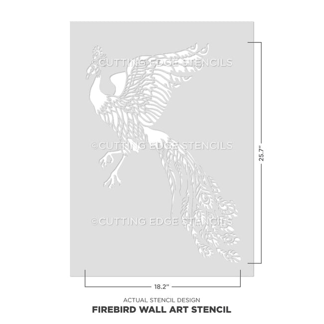 This fabulous Firebird Wall Stencil is designed by our good friend and visionary artist Tatyana Kiselyova. Firebird is a mythological bird from Russian fairy tales, that glows like a bonfire and is often an object of a difficult quest by a hero. It does look like a peacock, but is of course much more beautiful and powerful! The stencil captures the majestic beauty of this amazing bird, with amazing detail.