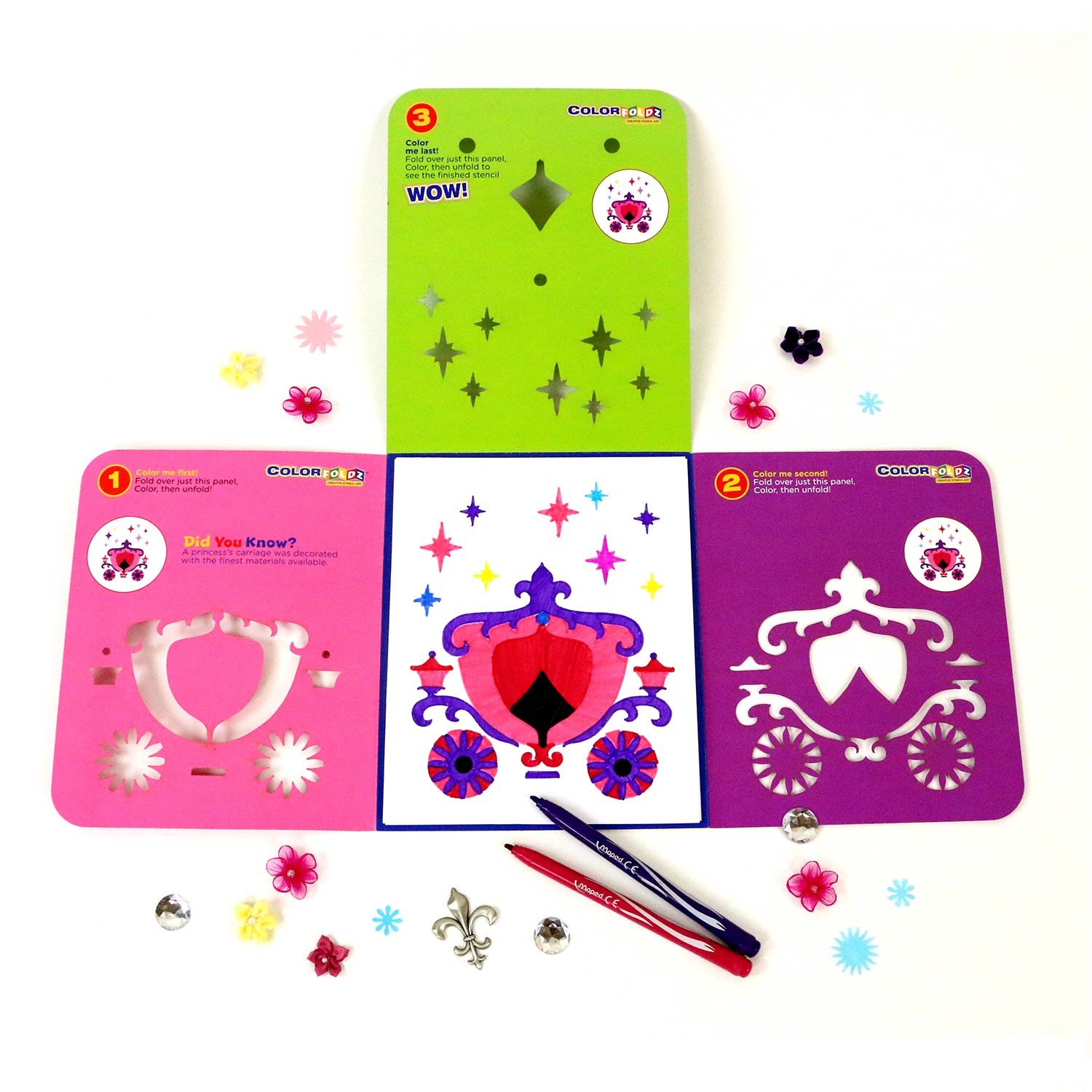 A cute Princess Carriage is waiting for it’s Princess! It’s so fun and easy to create beautiful multi-color pictures with ColorFoldz Self-Aligning Stencil, markers or colored pencils!