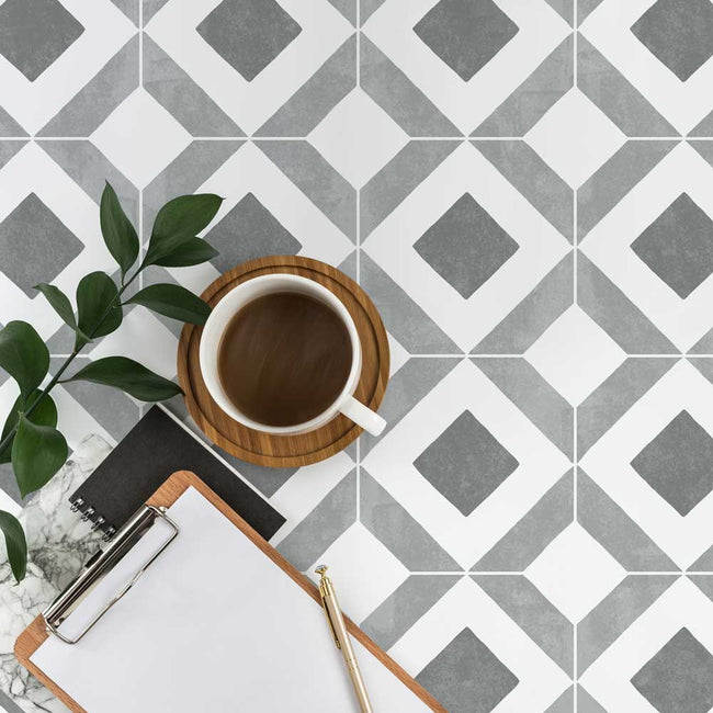 This geometric tile stencil design looks fabulous on accent walls, floors, fireplaces, and even kitchen backsplashes. Our tile stencil designs are super easy to use and provide big savings to more costly alternatives of wallpaper and floor tiles. Get a Pinterest-worthy tile floor for a fraction of the price of real tile! This stencil will definitely make a statement in your space! Learn How to stencil a tile – it’s easy even for beginners!
