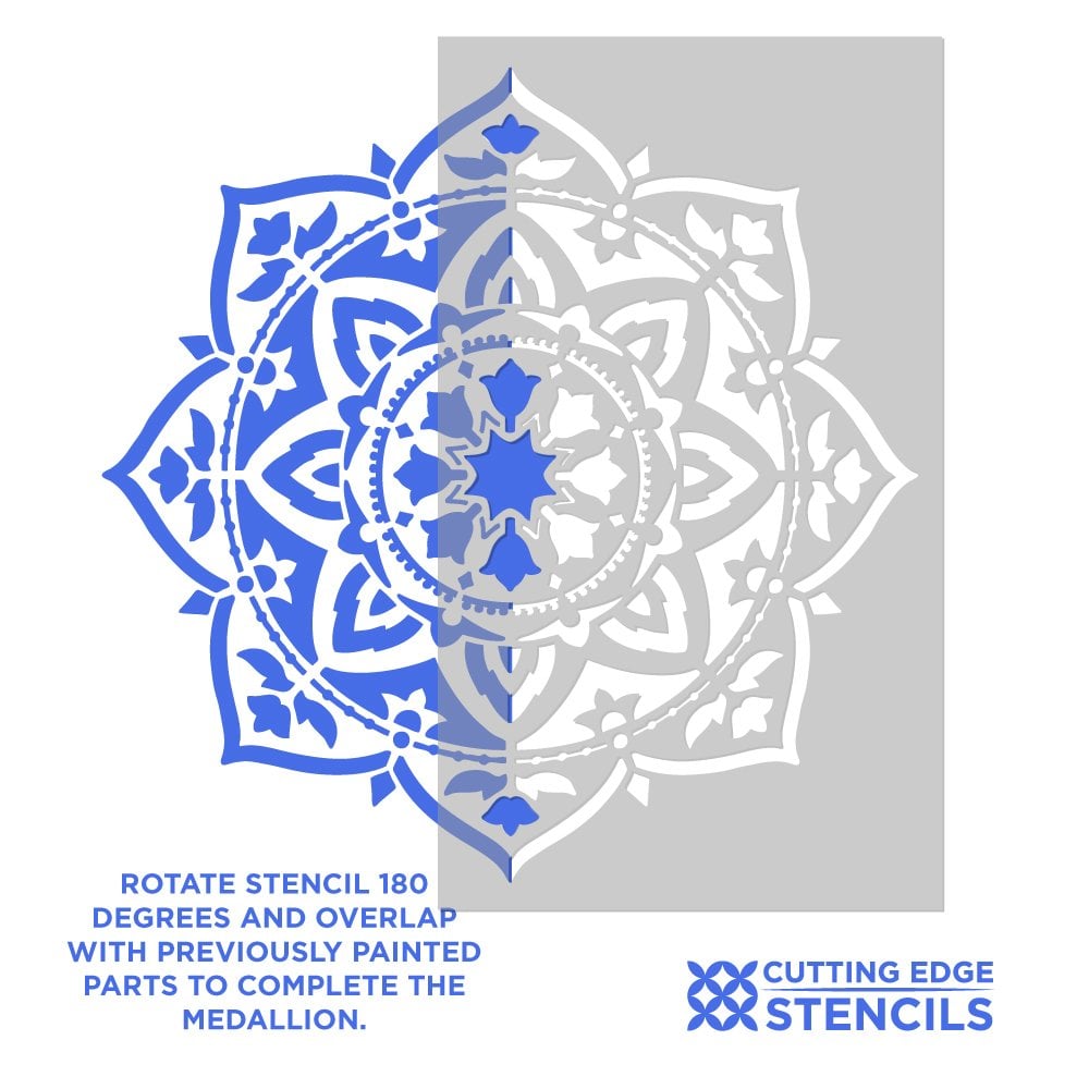 For the mandalas that are 10" to 30", you will be receiving a full medallion. For the 36" and 44" mandalas, you will receive half of the design and to complete the medallion, pick up the stencil after completing one side, flip it and line up the registration marks (see photo above), tape it and do it again.