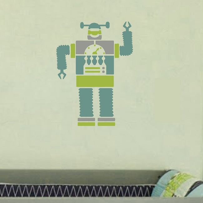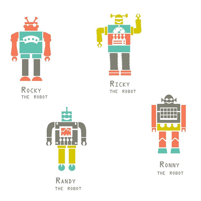 Our 4 Piece Robot Stencil Kit is the perfect way to introduce color and fun to your baby's nursery. Use these stencils to create an allover wall pattern, a focal point above the crib or a colorful piece of furniture. This versatile stencil kit makes nursery decor a snap! Kit includes Rickie, Ronnie, Randy and Rocky, the robots.