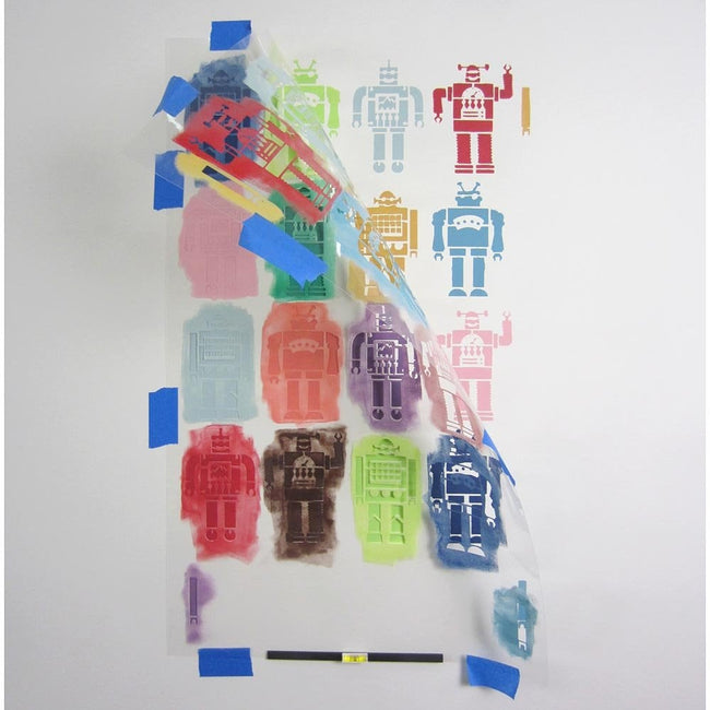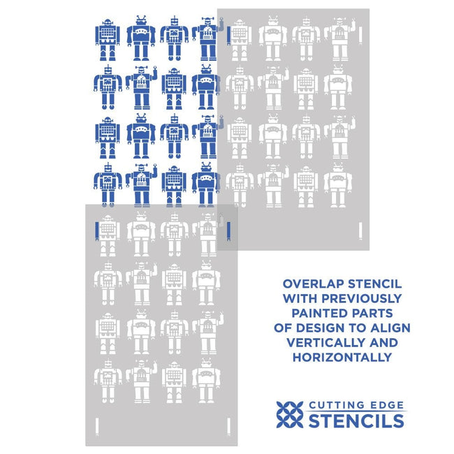 Can it get any more fun than this Robots Allover Stencil? Classic stylized robots are delightfully grouped in this stencil pattern, to create a fabulous allover look that is sure to make you and baby smile. Any little boy's room will look terrific with Robots standing guard. Looks great in multicolors or monochromatic. Retro, trendy and just plain terrific DIY project! Easy to make a fabulous accent wall with stencils. Cost-effective and fun to do.