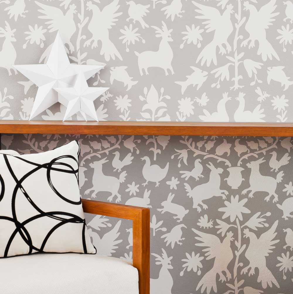 You can stencil with acrylic or latex paint, stencil creams, fabric paint or plaster of your choice. Use a foam roller or stencil brush. You can trowel the plaster through the stencil to achieve stunning dimensional effect. We recommend using stencil spray adhesive when working with large stencils, however it is not necessary. We just use blue tape.