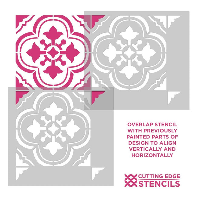 Stencil features an easy registration system, just use parts of the previously painted design to align the stencil, check for level and continue. This gives you a seamless "wallpaper" look. Don't worry about super perfect alignment: in the end your eye will never ever notice the discrepancy. While prior stenciling experience is a plus for allover stencil patterns, even beginners get great results!