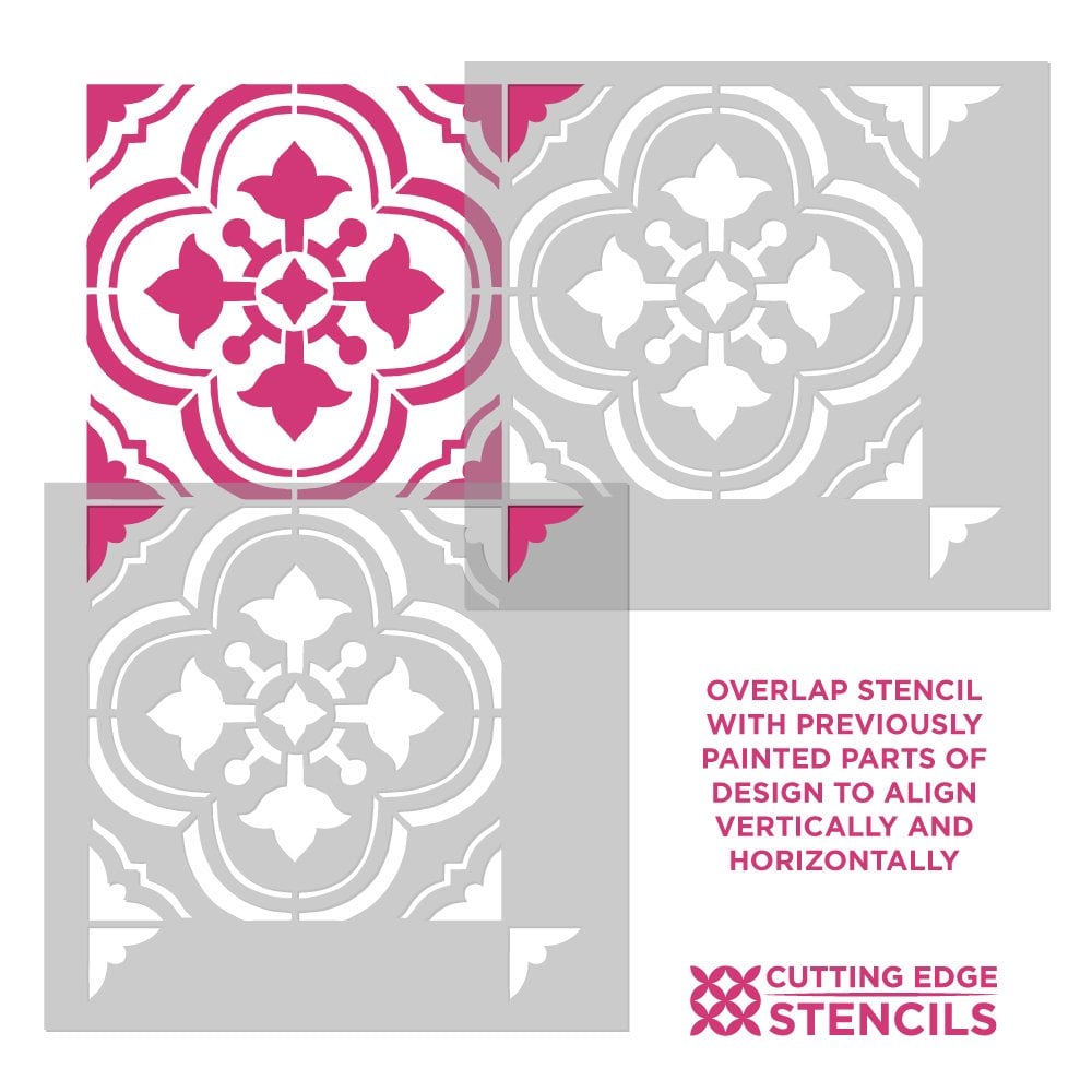 Our Santa Ana Tile stencil design is another fabulous design in our growing tile stencil collection. Inspired and designed based on Spanish and Portuguese tile patterns of the past that are so popular today. Our tile stencils look great on walls, kitchen backsplashes or instead of cement floor tiles. Our tile stencil designs are super easy to use and provide big savings to more costly alternatives of wallpaper and floor tiles. Get a Pinterest-worthy tile floor for a fraction of the price of real tile!