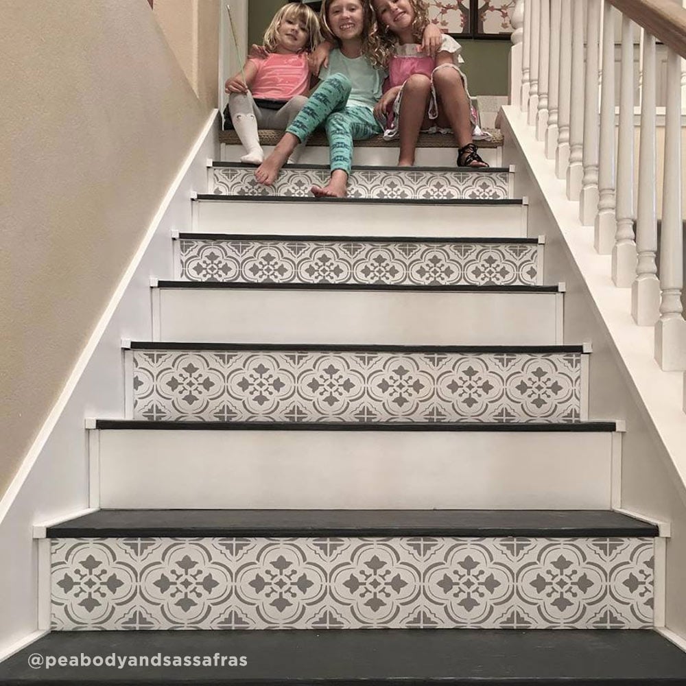 Larger tiles are best for the stenciled floors, but will look great on a wall too. Use smaller tiles for the backsplashes and stenciled stairs.