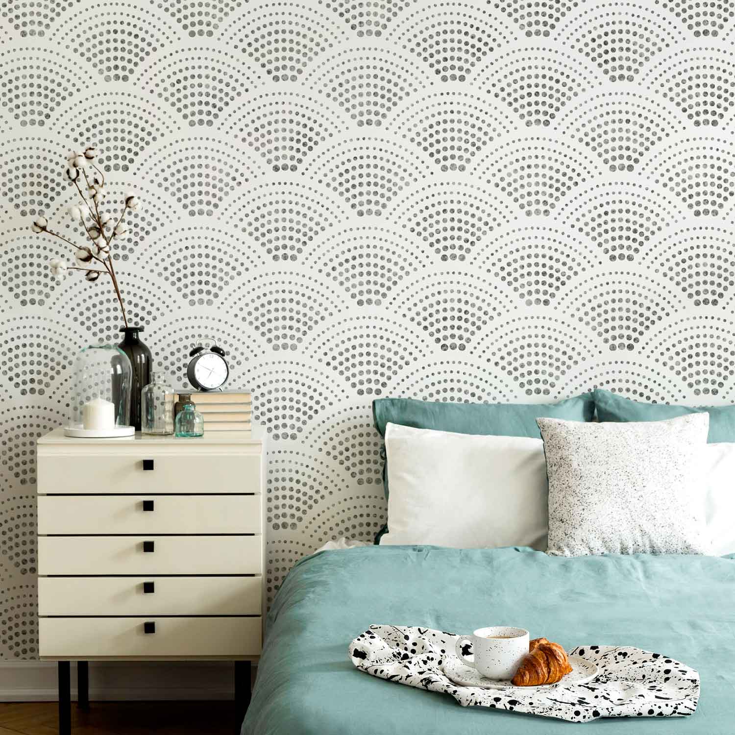 We love this mod Radiant Scallop stencil! You can use this wall design on a dining room wall, in a hallway, in a bath, or as a bedroom accent wall. Perfect scallop stencil design for midcentury interior or for a classy clean modern bedroom. Stencil it in metalics on a dark background color for a super glamorous effect! Dot patterns are having a huge comeback and this wall stencil is right on "spots" trend. Consider using a stencil for wall painting project instead of purchasing costly and difficult to install wallpaper.