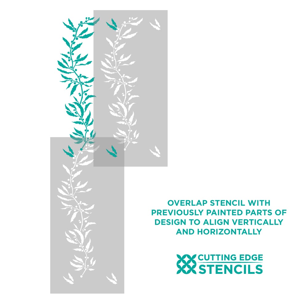 Stencil features an easy registration system, just use parts of the previously painted design to align the stencil, check for level and continue. This gives you a seamless "wallpaper" look. Don't worry about super perfect alignment: in the end your eye will never ever notice the discrepancy.